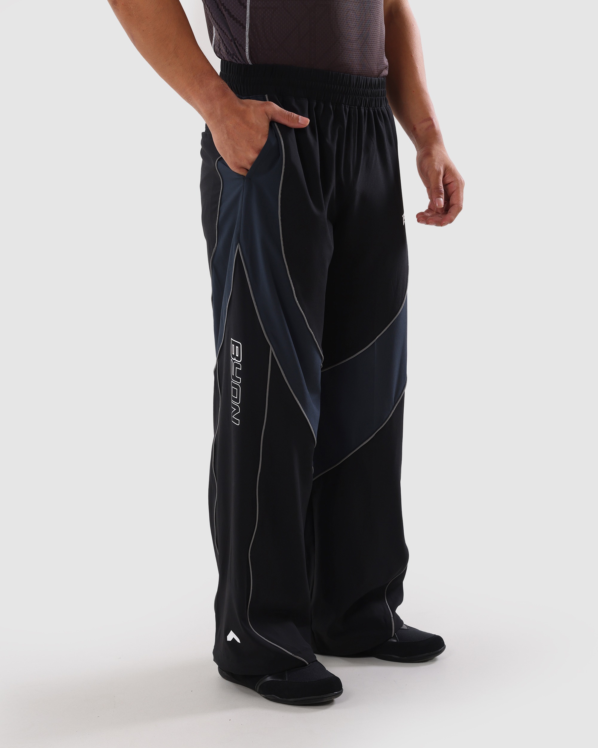 ERSPO menghadirkan BYON Track Pants, dibuat dari bahan ripstop yang kuat dan nyaman dengan warna utama black dan kontras grey. Dilengkapi pocket, elastic waist dengan drawcord, serta back pocket. Detail desain meliputi logo E polyflex, authentic woven label, typogram garis polyflex, logo BYON polyflex di sisi kaki, dan detail piping reflectivedi setiap cuttingan.